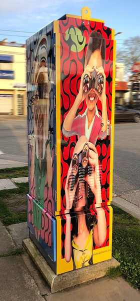 “This project at 34th Avenue and Victoria Drive in Vancouver is on one hand a response to the views of the city from this neighbourhood. Viewed closer we see people looking at each other and reflects upon the culture of online social interaction. The figures within the piece are looking at each other from afar through binoculars. The binoculars seem to me, a metaphor for how we interact online. We view people and their lives from a safe distance whether it’s by way of binoculars, computers or smart phones until we feel comfortable enough to reach out and engage each other. “